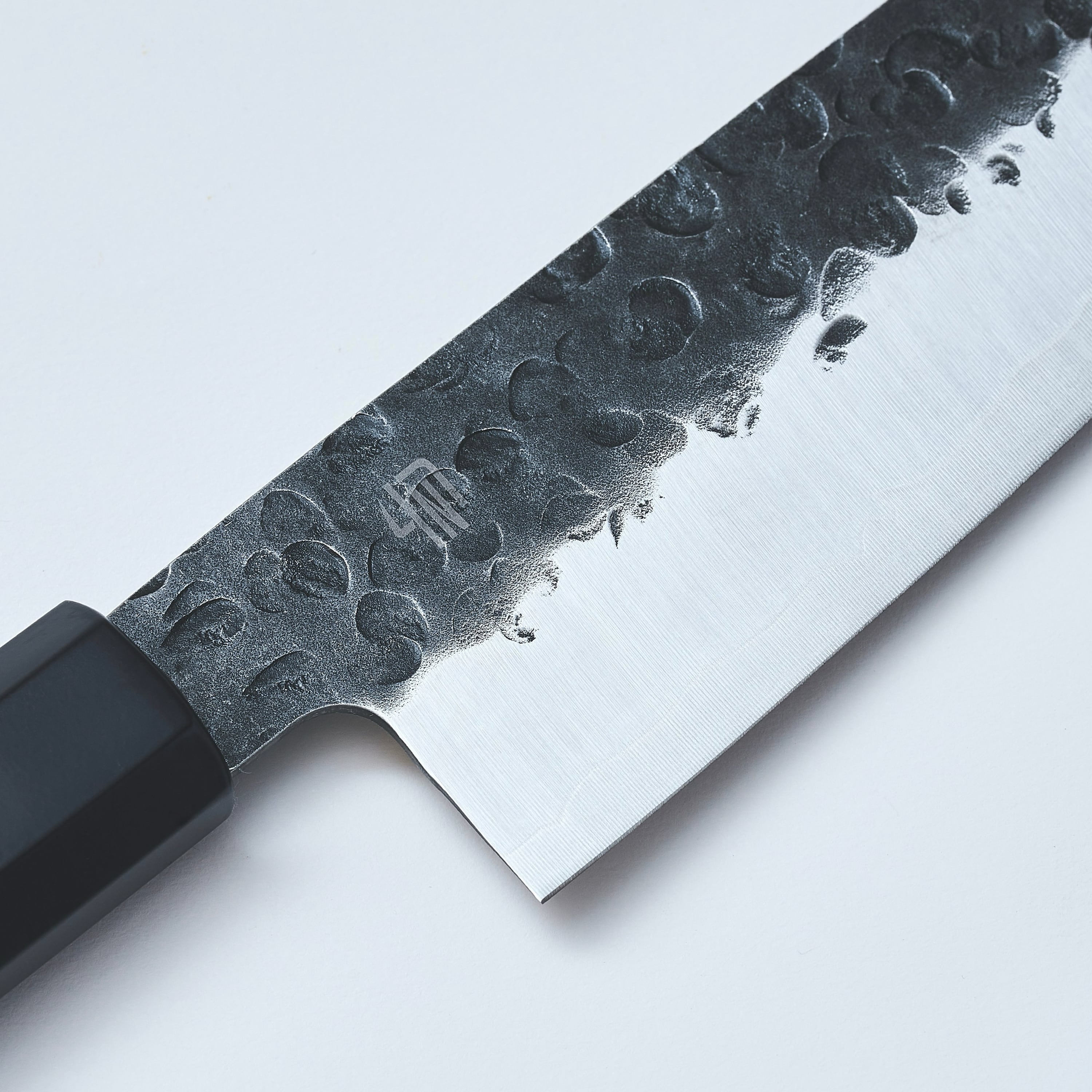 伝統的な黒打(くろうち)に、職人による槌目(つちめ=ハンマーで叩いた跡)が唯一無二の存在感を誇る1本です。黒打とは江戸時代発祥の伝統的な製法のことで、刃の表面にをあえて磨かず、黒い酸化被膜を残した仕様のことをいいます。これまでの黒打は酸化被膜ができやすい鋼(はがね)の素材で作られていましたが、切れ味が鋭いかわりに錆びやすい特性もありました。それを今回は錆びにくいステンレスで黒打を作ることに成功。和包丁の本格的な雰囲気をまといながらも、ご家庭でのメンテナンス性を両立させた1本です(このシリーズは鞘が入らないタイプですのでご了承ください)。
