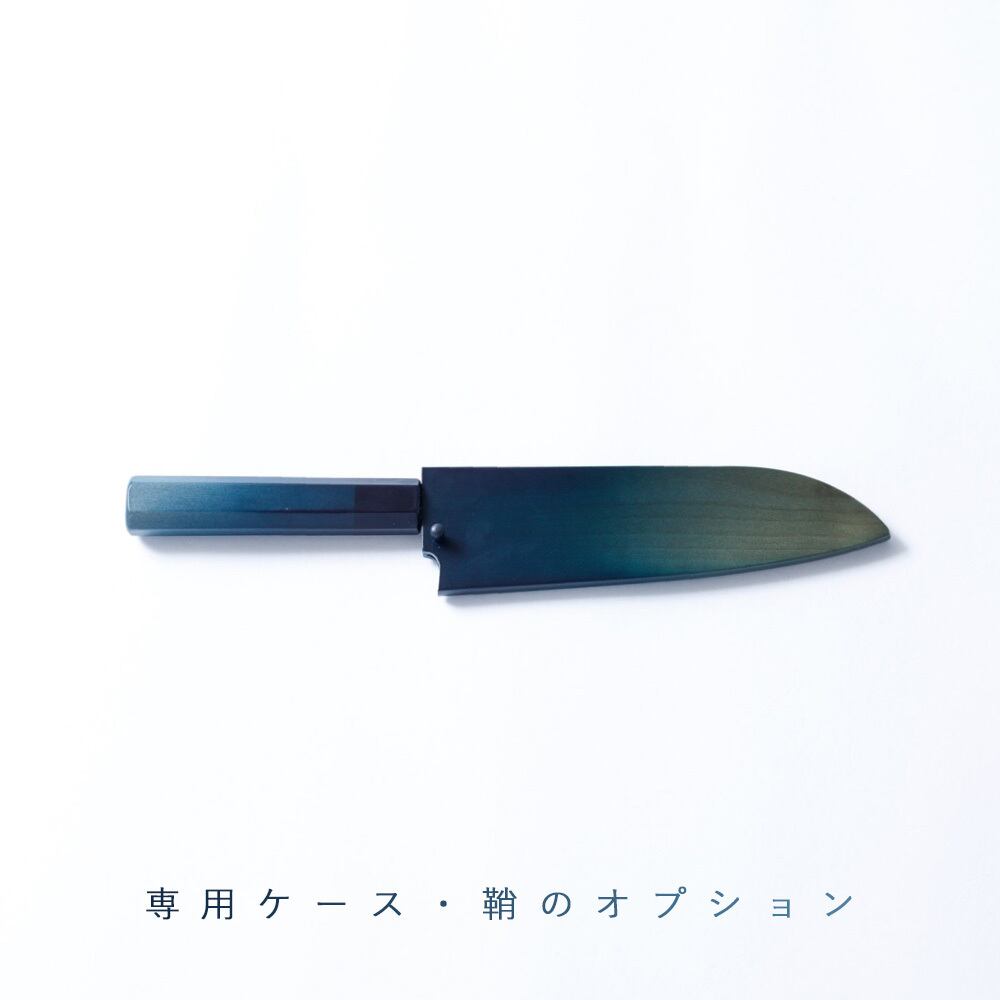 包丁の持ち手であるヒバ(柄)に藍染めが施されています。